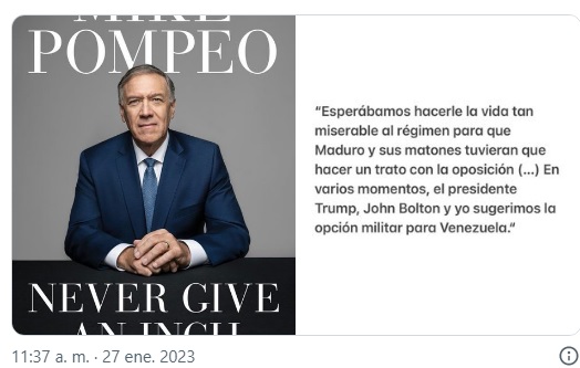 Pompeo publicó esta semana un libro de memorias titulado ‘Nunca cedas ni un centímetro’, texto en el que da detalles acerca de los planes y las decisiones que tomaron durante el gobierno de Trump, allí también ratifica que junto al exconsejero de Seguridad, John Bolton, y el propio expresidente (Trump), plantearon invadir Venezuela con tropas militares para provocar la caída de Maduro.