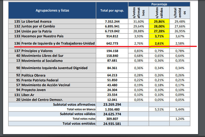 En el total de votos, La Libertad Avanza reunió 7.352.244, Juntos por el Cambio se quedó con 6.895.941 y Unión por la Patria obtuvo 6.719.042.