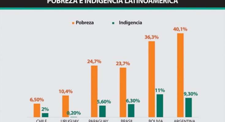 Para el caso de Chile, la pobreza es de 6,5%, Uruguay 10,4%, Brasil 23.7%, Paraguay 24,7%, Bolivia 36%, pero en relación a la indigencia si bien no somos el primero en la lista con un 9.3%, estamos en el segundo lugar con relación a Bolivia que hoy tiene un 11 por ciento.