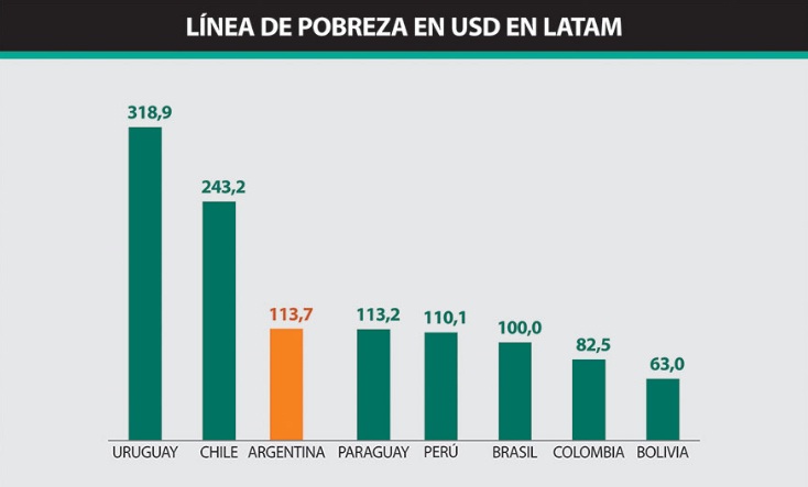 Es importante ver que todas las líneas de pobreza están compuestas en mayor proporción por el componente alimenticio basado en los principales elementos de la canasta básica de cada país, por lo que en un país como Argentina incide mucho más si la crisis inflacionaria muestra niveles de aumentos de precios por encima del 100 por ciento.