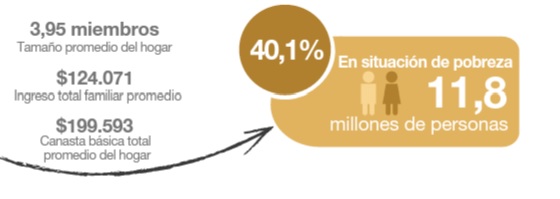 El porcentaje de hogares por debajo de la línea de pobreza (LP) alcanzó el 29,6%, en ellos reside el 40,1% de las personas. Dentro de este conjunto se distingue un 6,8% de hogares por debajo de la línea de indigencia (LI), que incluyen al 9,3% de las personas.