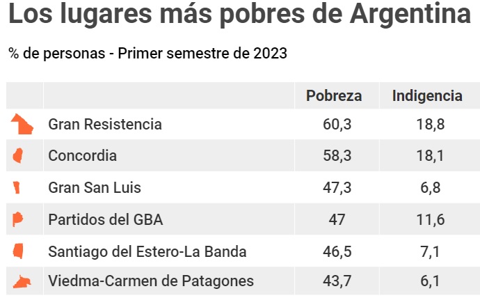 Además, las mayores incidencias de la pobreza en personas se observaron en las regiones Noreste (NEA), 42,0%; y Gran Buenos Aires, 41,4%. Las menores, por su parte, se registraron en las regiones Patagonia, 33,2%; y Pampeana, 36,8%.