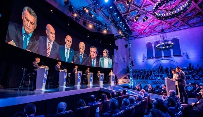 El primer debate presidencial obligatorio por ley se desarrolló en la Universidad del Litoral, participaron todos los candidatos,  Alberto Fernández, Mauricio Macri, Roberto Lavagna, Del Caño, Espert y Gómez Centurión.
