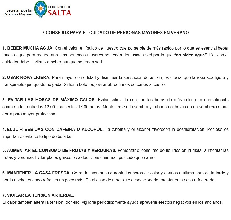 Ante las altas temperaturas, se insiste en recomendaciones a tener en cuenta para proteger a los adultos mayores. O’Brian sugirió visitar la página de Facebook “Personas Mayores de Salta” para obtener más información y consejos.