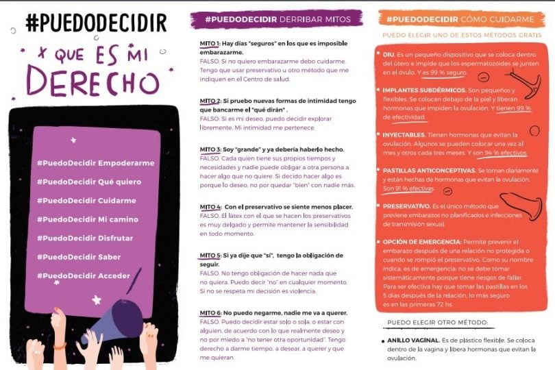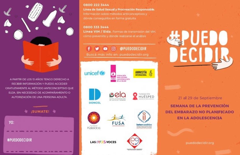 Del 21 al 28 de septiembre se desarrollará la campaña #PuedoDecidir, liderada por la Fundación para Estudio e Investigación de la Mujer (FEIM), UNICEF, Amnistía, Fundación Huésped y otras seis organizaciones no gubernamentales. El objetivo es prevenir los embarazos no planificados, brindando información y haciendo foco en el derecho al acceso a la salud, el derecho a vivir una vida libre de violencia y el derecho a decidir dónde, cuándo y con quién tener relaciones sexuales.