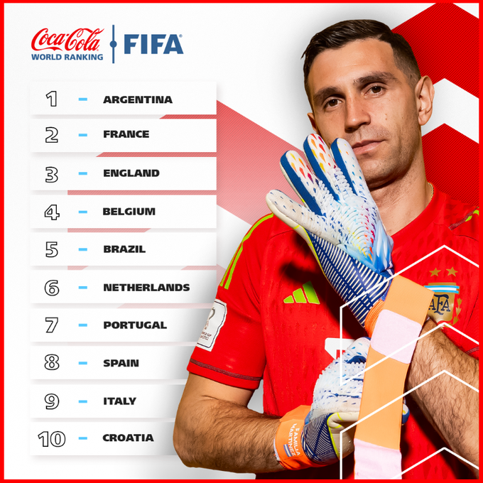 El seleccionado argentino masculino de fútbol, campeón del mundo en Qatar 2022, sigue liderando la tabla de posiciones de la FIFA, que actualizó su ranking la FIFA.