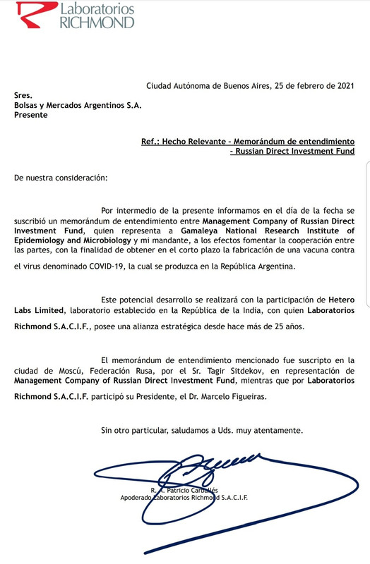 El laboratorio Richmond firmó un memorándum de entendimiento con el Fondo de Inversión de Rusia para producir la vacuna Sputnik V contra el coronavirus en Argentina.