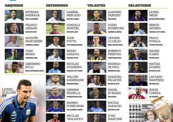 Por el momento la lista de Scaloni tiene estos futbolistas escogidos y que sirven de base para confeccionar la presentación de 23 que dirán presentes en Brasil: