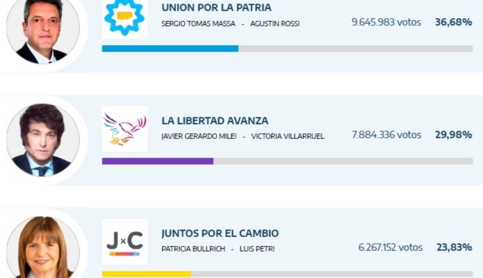 Unión por la Patria (UxP) posiciona a Sergio Massa como el candidato presidencial más votado con el 36,68% , la Libertad Avanza, Javier Milei, quien obtenía el 29,99%. Escrutado el 98,37% de las mesas.