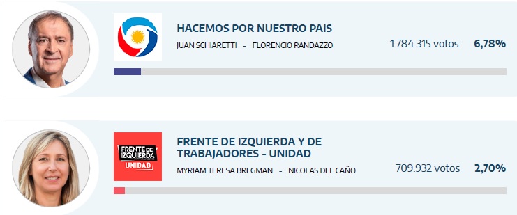 Muy lejos en números quedaban Schiaretti, aunque el representante del peronismo cordobés logró duplicar el respaldo que había conseguido en las primarias y sumaba ahora un 6,79% de votos y Bregman, quien casi repitió los resultados de agosto, con el 2,69%.