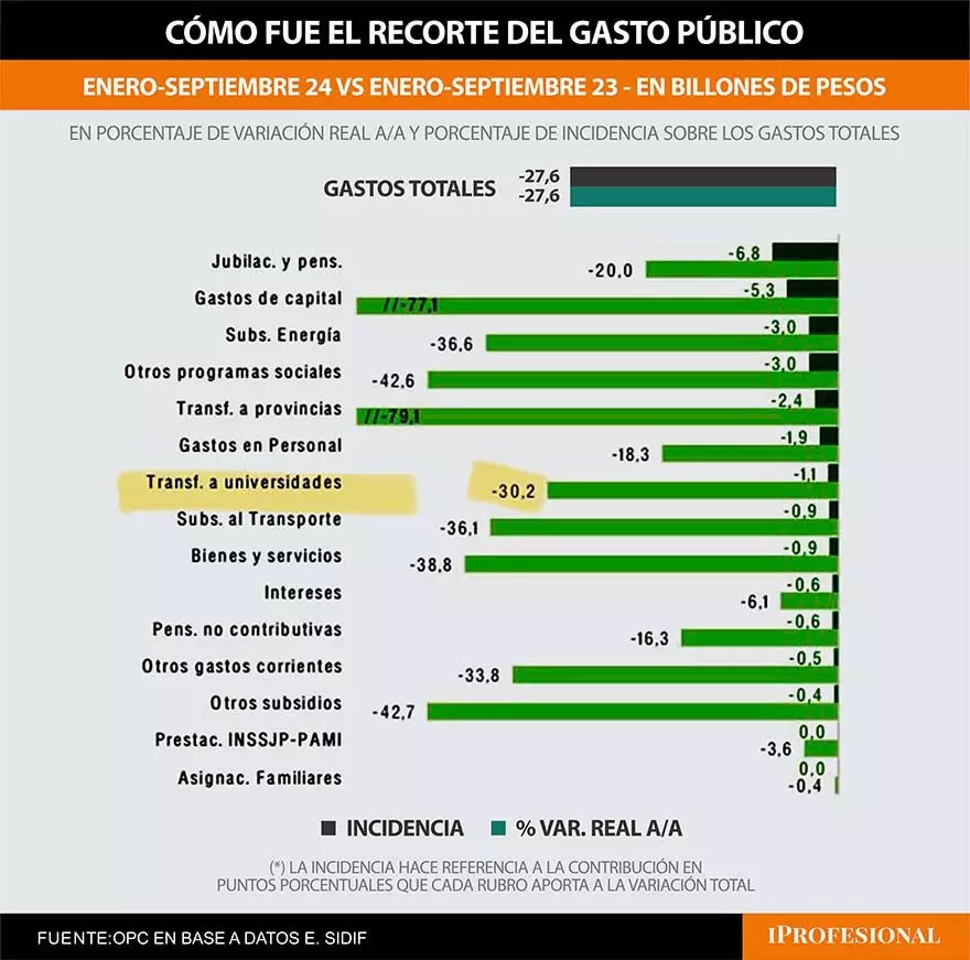 También señaló que en el período enero-septiembre dde 2024 el gasto primario se redujo 30% en términos reales contra el mismo período de 2023. Según Economía, los rubros que registraron las mayores bajas fueron el Gasto de Capital (obras públicas) -79%, Transferencias Corrientes Discrecionales a Provincias (-70%) y Resto de Gasto Corriente (-52%). En el comunicado oficial no consignó la reducción de las partidas de jubilaciones y de educación, aunque señaló que los subsidios económicos se redujeron 34%, en coincidencia con los números de la Oficina de Presupuesto.