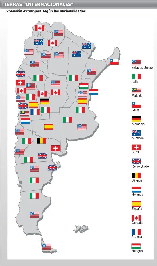 Con una cota del 15% de tierras en manos extranjeras, hay localidades como San Carlos (Salta) donde supera el 50%. Existen 36 departamentos que ya exceden el límite fijado por la Ley de Tierras, ellas son Lácar (Neuquén), General Lamadrid (La Rioja) y Molinos y San Carlos (Salta)– donde la extranjerización supera el 50%: todos concentran agua dulce o minerales. A su vez Iguazú (Misiones), Ituzaingó y Berón de Astrada (Corrientes), y Campana (Buenos Aires) —todas localidades sobre la principal vía fluvial navegable del país, el río Paraná— superan ampliamente el 30%”. Casi el 5% son estadounidenses.