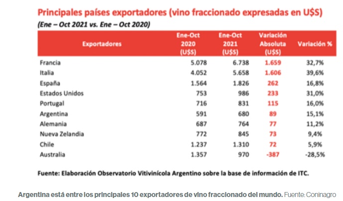 Durante el 2021 la exporatación de vino llegó a los u$s 817 millones, pero si le sumamos la venta a granel y mosto concentrado se llega a u$s 1000 millones.